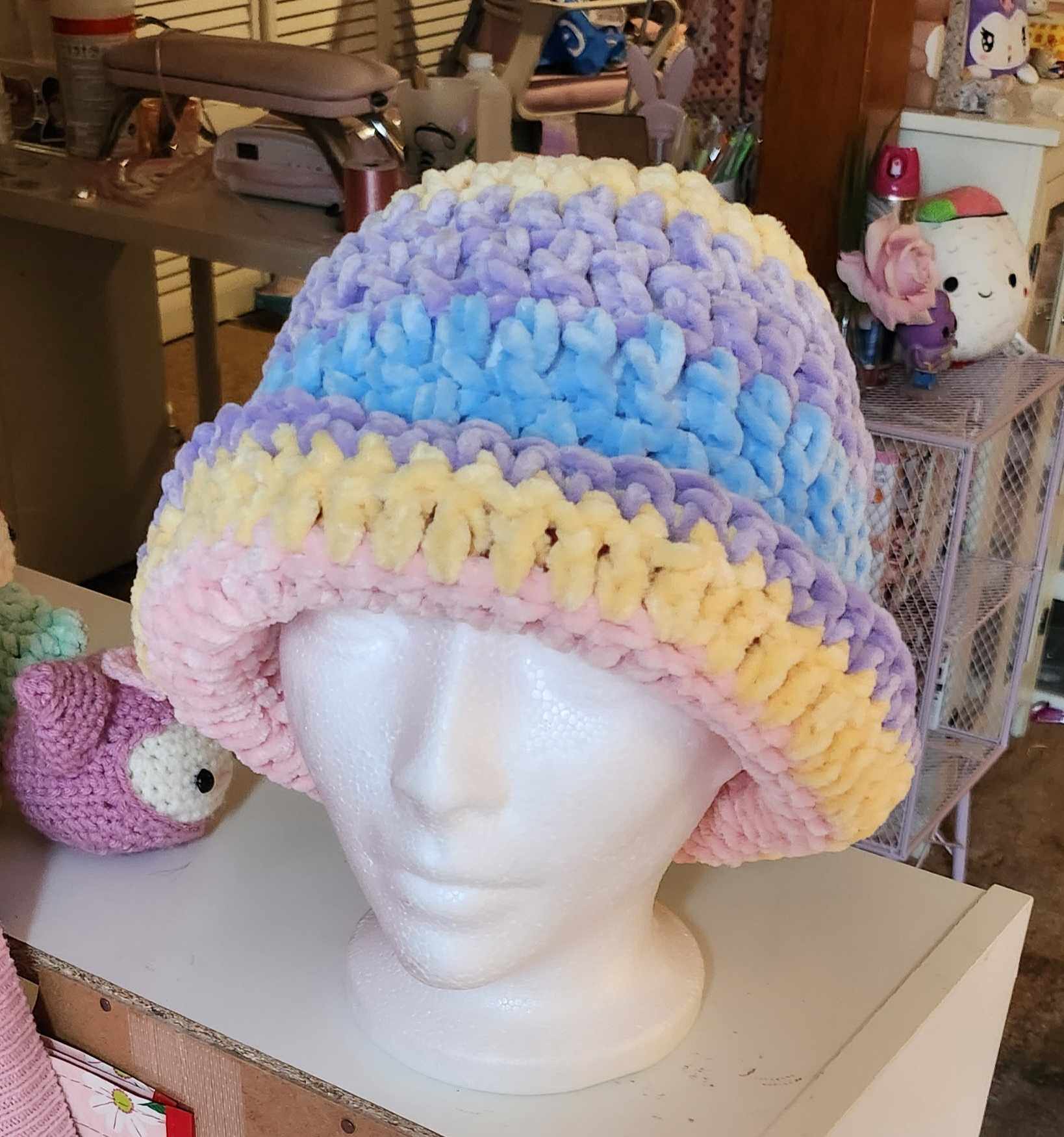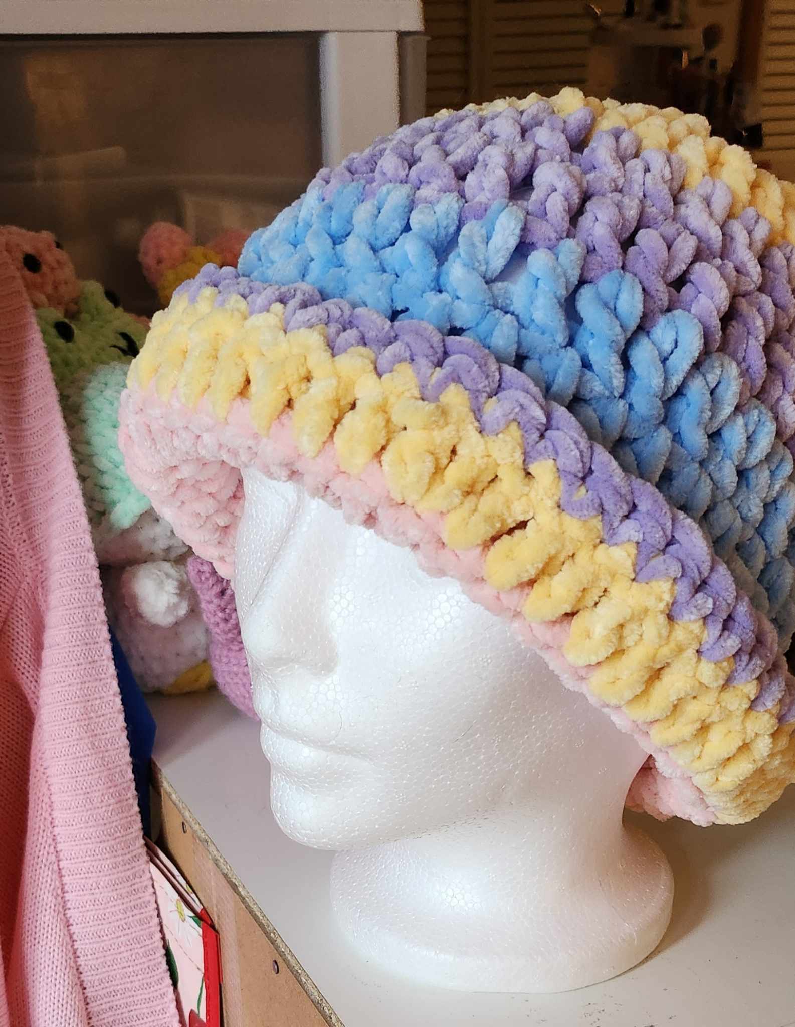 This comfy beanie is one of my favorites! It's made out of plushie yarn, and handmade. Keep your head warm and cute at the same time .